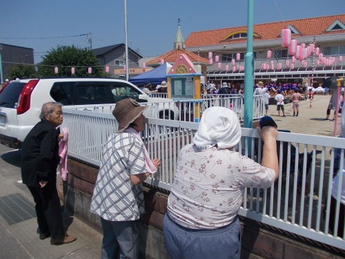 保育園が近づくにつれ先生方や子供たちの歓声、太鼓の音などがにぎやかに聞こえてきます。お年寄りも自然と足早になりました。